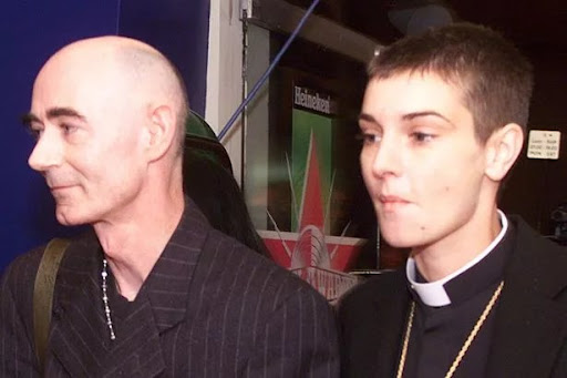 Sinead o' connor looking mournfully son shane shaved head.